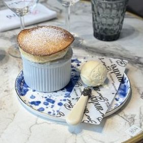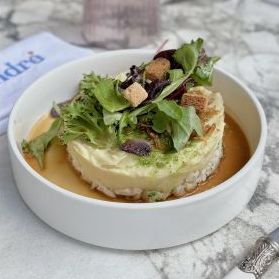 Accompanied by golden croutons, rust, grated Emmental
