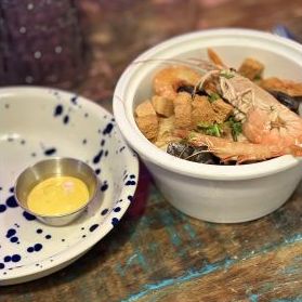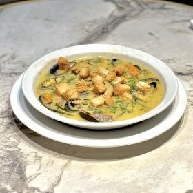 Accompagnée de croûtons dorés, rouille, emmental râpé́