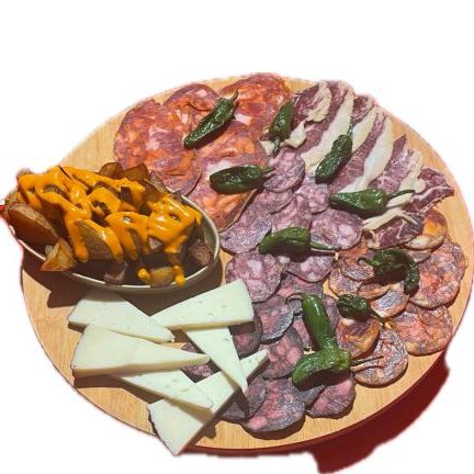 Tabla de embutidos ibéricos, pimientos marinados, patatas brava para 4