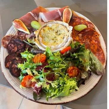 Charcuterie, fromage, poivrons, foie gras, saumon , magret séché, patatas bravas