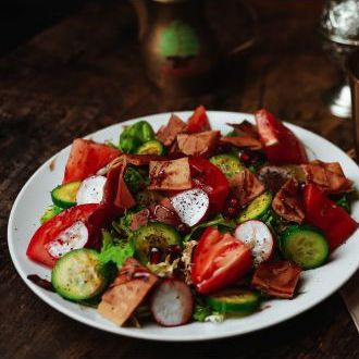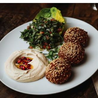 kikkererwten, sla, tomaat, ui, sesamsaus.
