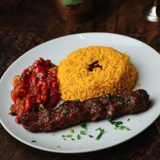 フライドポテトまたはライス、ボーフグリル、フライドオニオン、ハラビーノ、シェフソース。