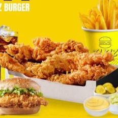 chicken burger , 2 tenders, 2 wings, fries, sauce