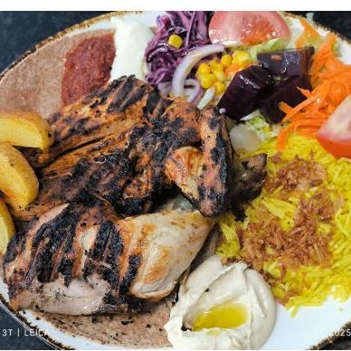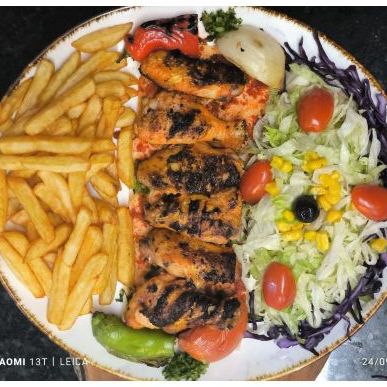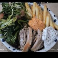 blanc poulet grille , salade, cornichon ,sauce d ail+friets+boissons
