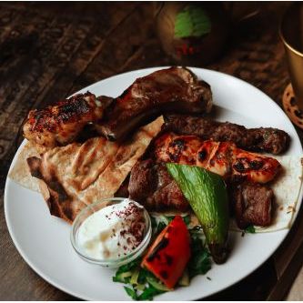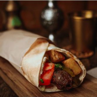 Картофель фри или рис, боф на гриле, жареный лук, халабино, соус от шеф-повара.