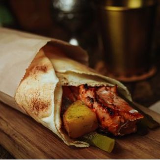 Witte gegrilde kip, salade, augurk, knoflooksaus.