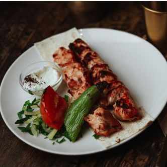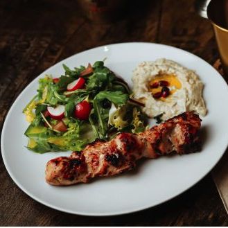 pollo blanco a la parrilla, ensalada, pepinillos, salsa de ajo.