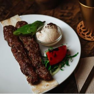 Hackfleisch, Tomate, Zwiebel, Gurken, Sesamsauce.