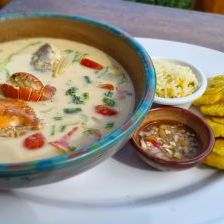 Our homemade rich seafood bouillon, with whole sea bass fish, shrimps, crab, veggies, accompanied with tostones and rice.